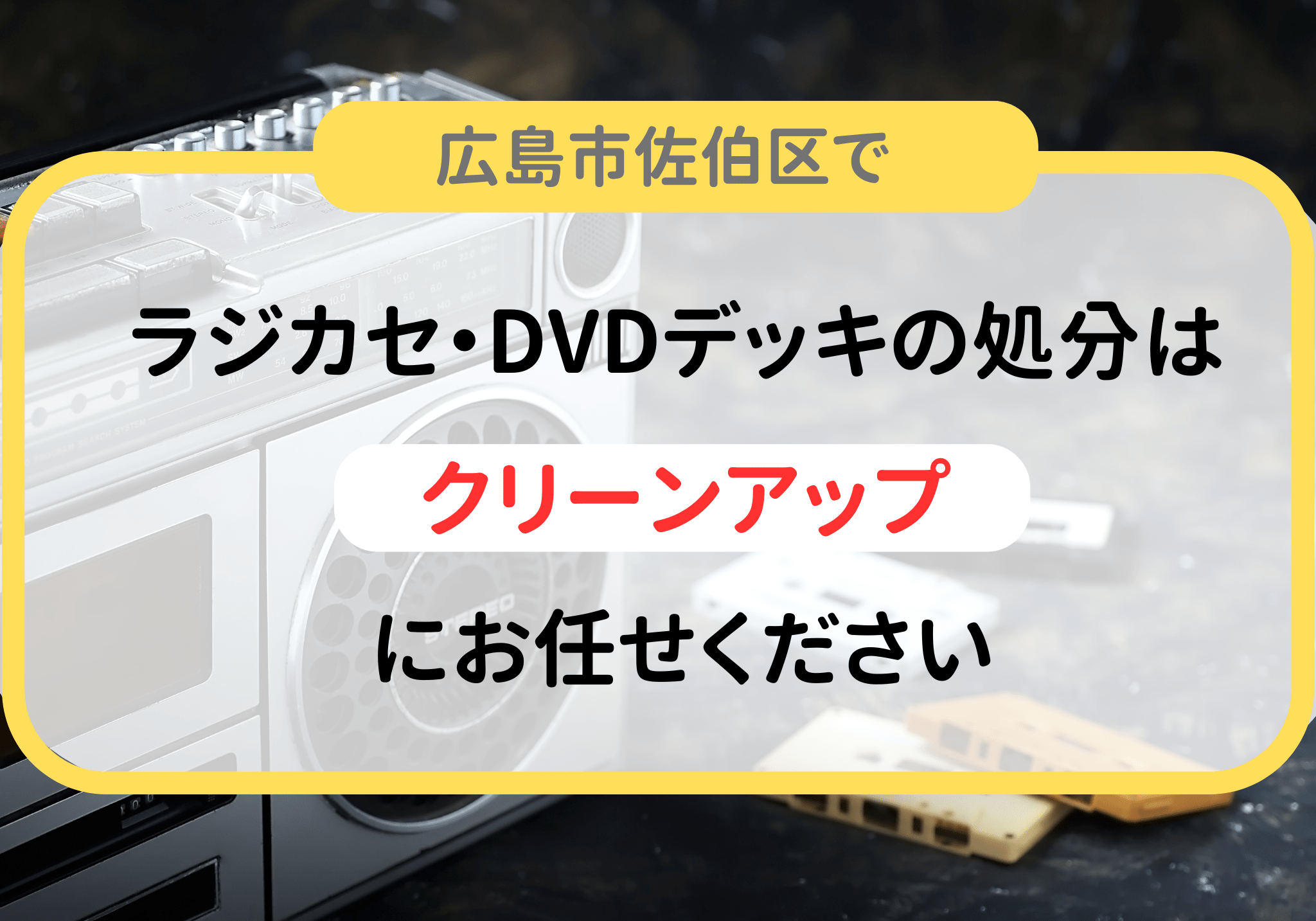 広島市佐伯区でラジカセ・DVDデッキの処分にお困りの方は便利屋「クリーンアップ」におまかせください。ラジカセ・DVDデッキの処分は2,200円〜で対応しています。お見積もりは無料ですのでお気軽にご相談ください。