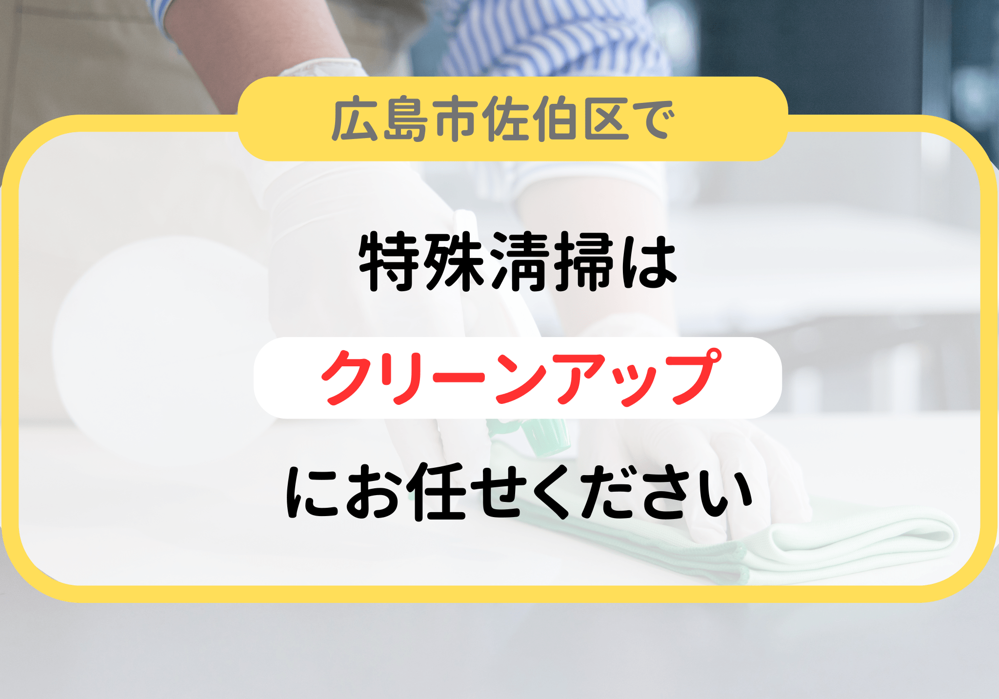 広島市佐伯区で特殊清掃を希望される方は便利屋「クリーンアップ」におまかせください広島市で特殊清掃のご依頼は便利屋「クリーンアップ」におまかせください。特殊清掃は88,000円〜対応可能です。現場の状況やご依頼内容などにより料金は異なります。お見積もりは無料ですのでお気軽にご相談ください。ハウスクリーニングでは落とせない汚れや壁紙、床材剥がしなどの処理も特殊清掃であれば対応可能です。また、臭いが染みついている場合は消臭作業も行います。特殊清掃に関する依頼例を以下の通りです。虫が大量に発生しているゴミが散乱して対処できない悪臭が染みついている室内がかなり汚れている原状回復してほしい特殊清掃は害虫駆除や清掃、消臭や殺菌などの作業を行います。特殊清掃をご希望の方はお気軽にご連絡ください。※電話に出られず折り返す場合はこちらの番号07042164996よりかけ直しいたします。 特殊清掃の費用の目安特殊清掃にかかる費用は部屋の広さや依頼内容により異なります。お部屋の広さによる概算費用は以下の通りです。〜1LDK88,000円〜2DK〜2LDK154,000円〜3DK〜198,000円〜4LDK253,000円〜特殊清掃にかかる費用は室内の広さやご依頼内容などにより異なります。作業内容によって対応するスタッフの人数や準備する機材など調整可能です。現地調査した上でお見積もりしますのでご相談ください。特殊清掃の作業内容特殊清掃は室内を調査した上でプランを提案します。主な作業内容を以下の通りです。汚染箇所と部屋全体の清掃・クリーニング室内清掃では汚染箇所の清掃・クリーニング作業を行います。布団やベッド床材はダニや血液、排泄物などで汚染されていることもあります。どのような状態でもご相談ください。害虫駆除特殊清掃では害虫の駆除も承っています。成虫や幼虫、卵など状況を確認し、適切に駆除作業を行います。消臭、殺菌、消毒部屋をクリーニングしても悪臭は取れません。消臭や殺菌、消毒作業を丁寧に行います。不用品撤去・遺品や貴重品の分別特殊清掃を行う現場では貴重品も残っていることが多いです。不用品処分や遺品整理にお困りの場合は、分別も含めて臨機応変に対応いたします。特殊清掃をご利用までの流れ特殊清掃の利用方法をご紹介します。STEPお問い合わせ・ご相談対応電話かライン、お問い合わせフォームからお気軽にご相談ください。お問い合わせの際に、ご希望の作業内容を伝えていただけるとその後スムーズに進みます。概算を把握したい場合は、写真などをラインやメールなどで送っていただければ対応可能です。※電話に出れず折り返す場合はこちらの番号07042164996よりかけ直しいたします。STEP現地調査・見積もり金額の提示特殊清掃の正確な費用を算出するため、スタッフが現地にて無料でお見積もりいたします。お見積もり後のキャンセルにも対応しますので、お気軽にご相談ください。STEP作業内容の打ち合わせご契約後は作業内容を打ち合わせします。日程調整や作業内容などご希望がありましたら、臨機応変に対応可能です。STEP特殊清掃作業依頼内容と日程が決まりましたら、特殊清掃作業を行います。作業終了後、その他ご要望がなければ料金をお支払いいただいて作業完了です。特殊清掃でよくある質問特殊清掃に関するよくある質問をまとめました。急いでいるのですが早急に依頼できますか?ご希望に合わせて早急に対応いたします。日程調整しますので、お気軽にご相談ください。作業時の立ち会いは必須ですか?立ち会いなしでも対応しています。遺品整理を検討している方は、残したい物などを打ち合わせ時にお伝えください。周囲に知られたくないので内密に作業できますか?清掃作業では多少の騒音は発生しますが、周囲の迷惑にならないよう配慮して作業します。時間帯なども調整可能ですので、心配な方はご相談ください。見積もり金額以外の追加費用は発生しますか?お見積もりで提示した金額以外の費用はかかりません。ただし、作業当日に追加のご希望がある場合は別料金が発生するケースがあります。その場合は再度お見積もりしますので、納得した上でご依頼ください。特殊清掃とはどのような作業ですか?特殊清掃とは通常の清掃作業では落とせない汚れを特殊な方法で掃除することです。事件や自殺、孤独死などの現場や、大量のゴミや悪臭、害虫などの状況で作業します。特殊清掃を依頼したい方は便利屋「クリーンアップ」におまかせください特殊清掃をご希望の方は便利屋「クリーンアップ」におまかせください。特殊清掃は88,000円〜対応いたします。ご希望の依頼内容や状況によっても料金は異なります。お見積もりは無料です。電話(0120-606-538)やメール、ラインで対応いたします。電話に出られずに折り返す場合はこちらの番号(070-4216-4996)から掛け直します。まずは、お気軽にご相談ください。※電話に出られず折り返す場合はこちらの番号07042164996よりかけ直しいたします。