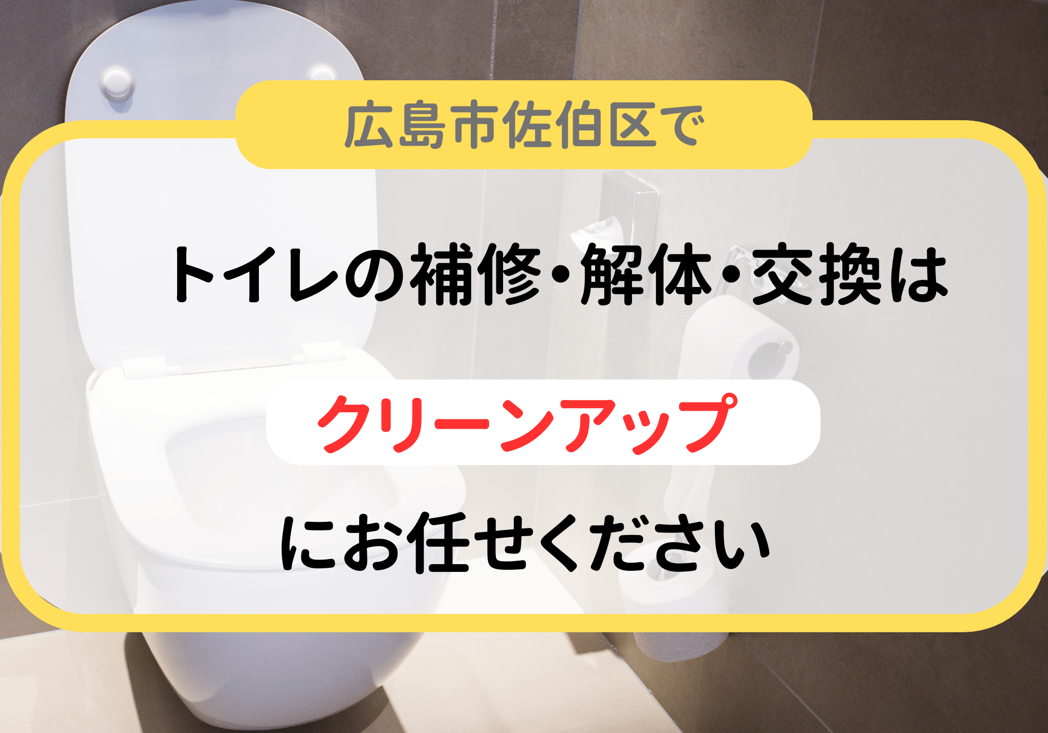 トイレの便器が割れたり水漏れしたりするなどのトラブルを解消できずにお悩みの方は便利屋「クリーンアップ」にお任せください。トイレの補修・解体・交換は22,000円〜にて承っております。